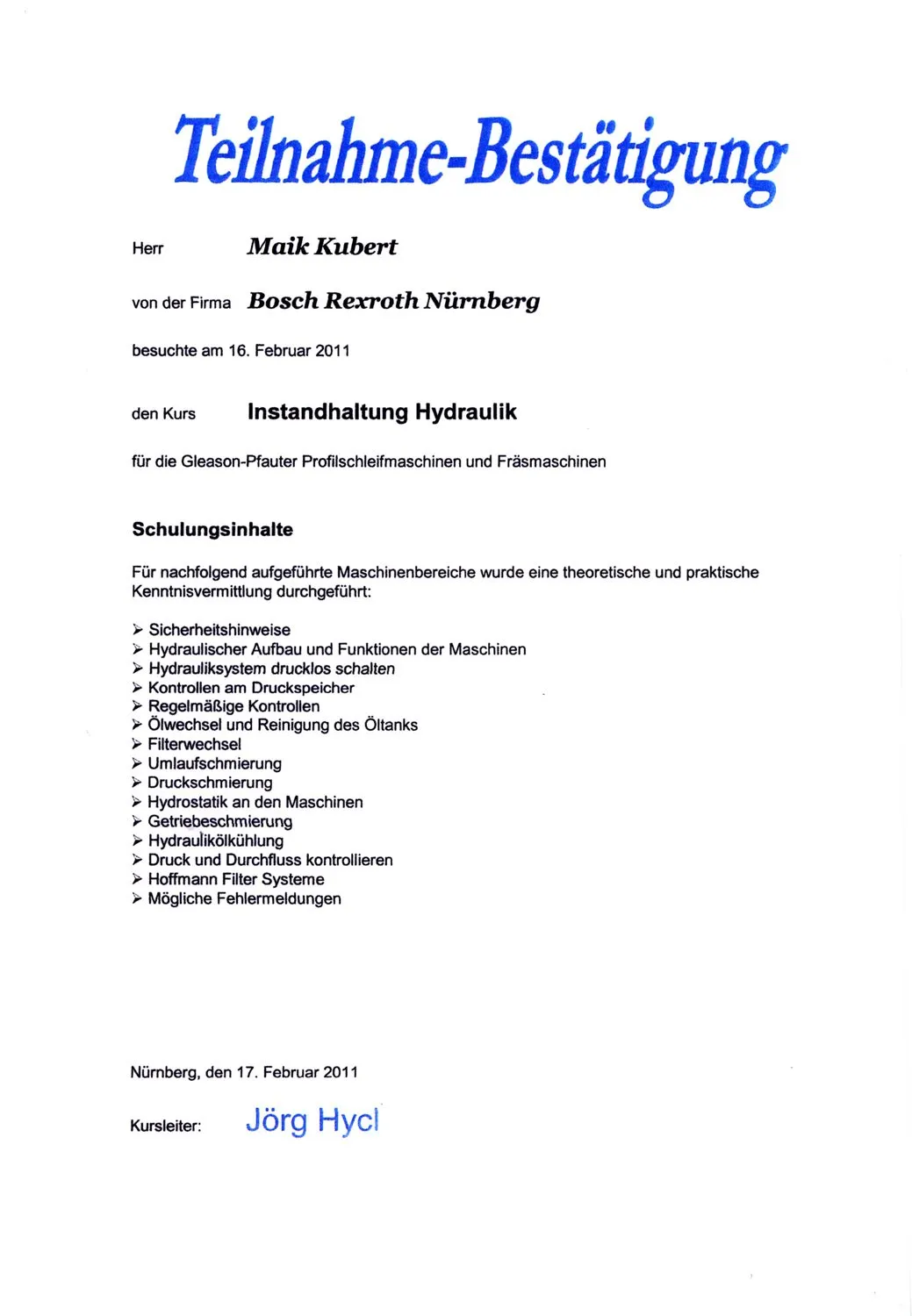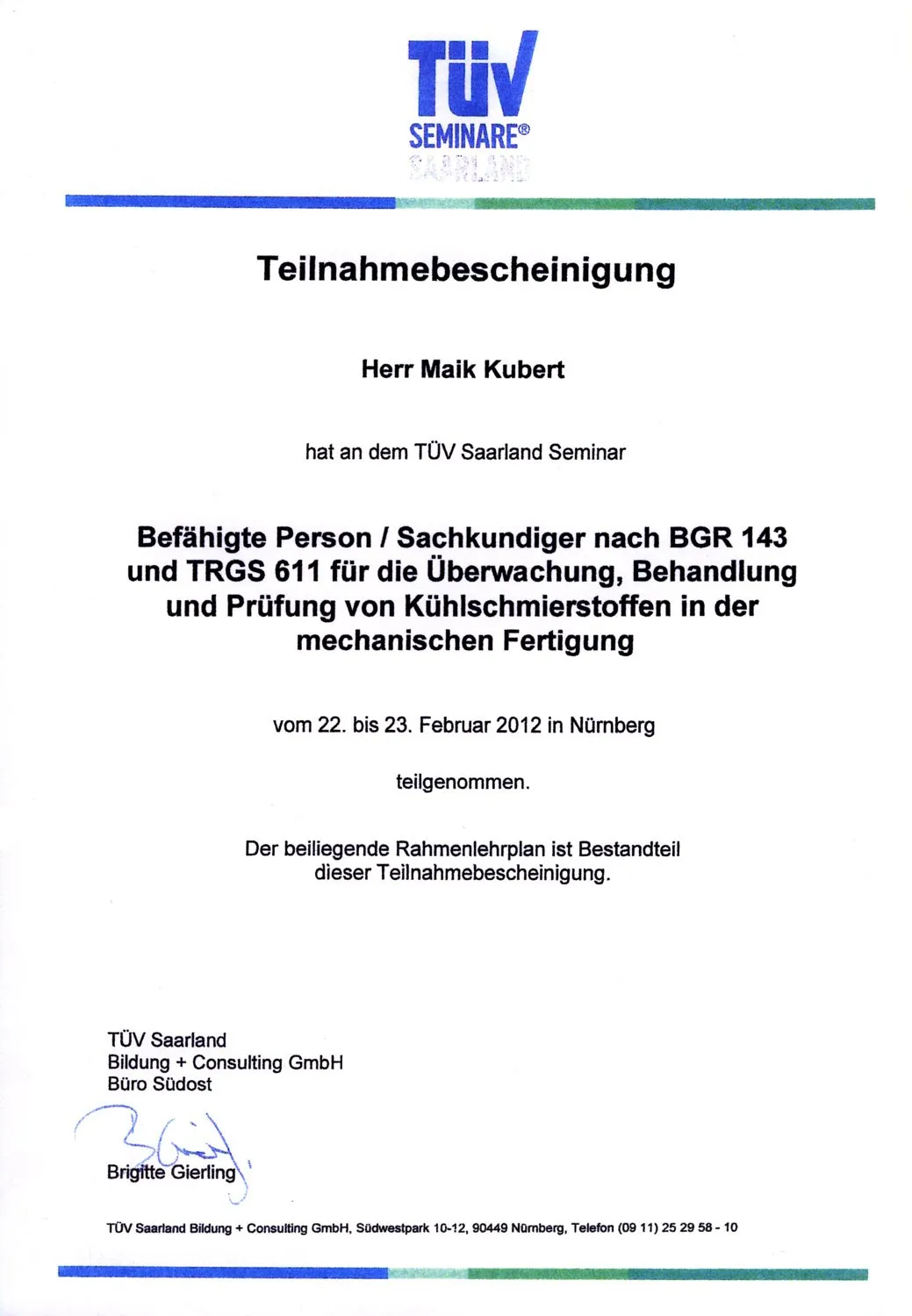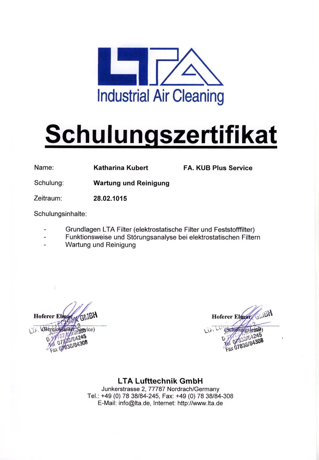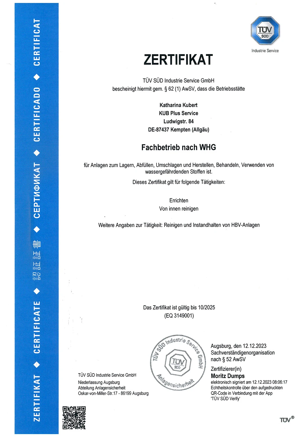 Das Wasserhaushaltsgesetz (WHG) verlangt für bestimmte Tätigkeiten, wie etwa chemische Reinigungen, eine Zertifizierung als Fachbetrieb gemäß WHG. Diese Zertifizierungen haben wir als Betrieb erworben. Darüber hinaus verfügen wir über diverse weitere Zertifikate für die Wartung spezifischer Maschinen.